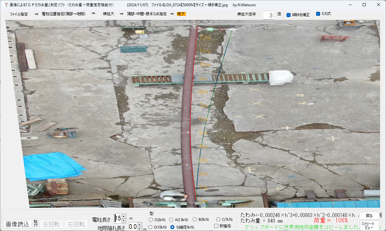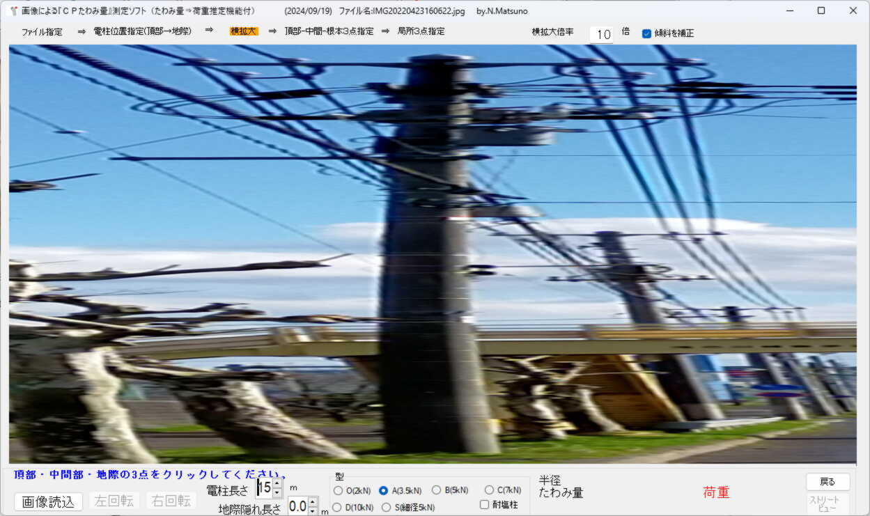 画像による『CPたわみ量』測定ソフトは、電柱を撮影した画像から『たわみ量』を測定し、推定荷重を求めるソフトです。
